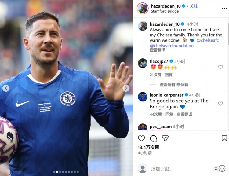 重返斯坦福桥参加传奇赛,阿扎尔:见到切尔西大家庭总是很开心
